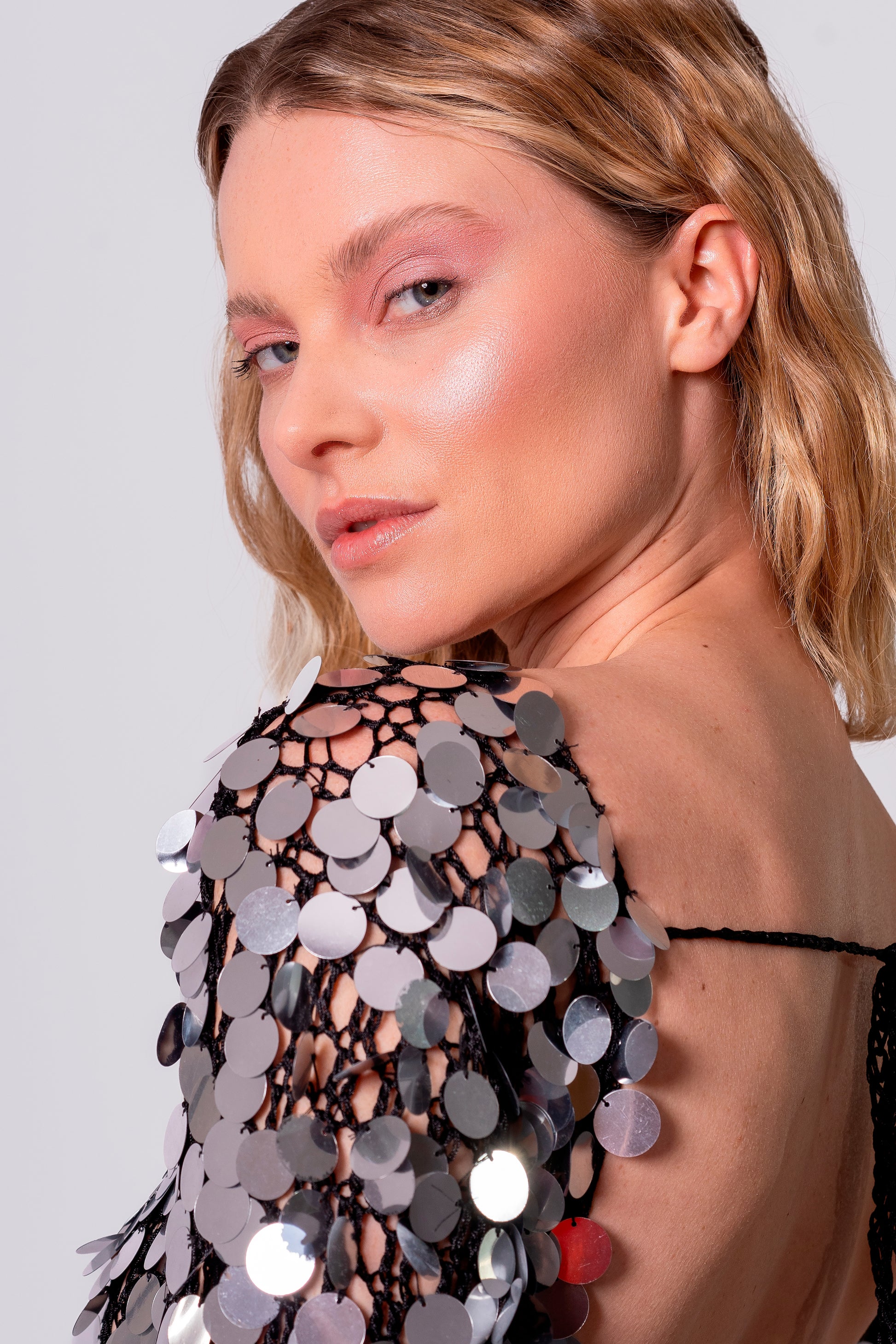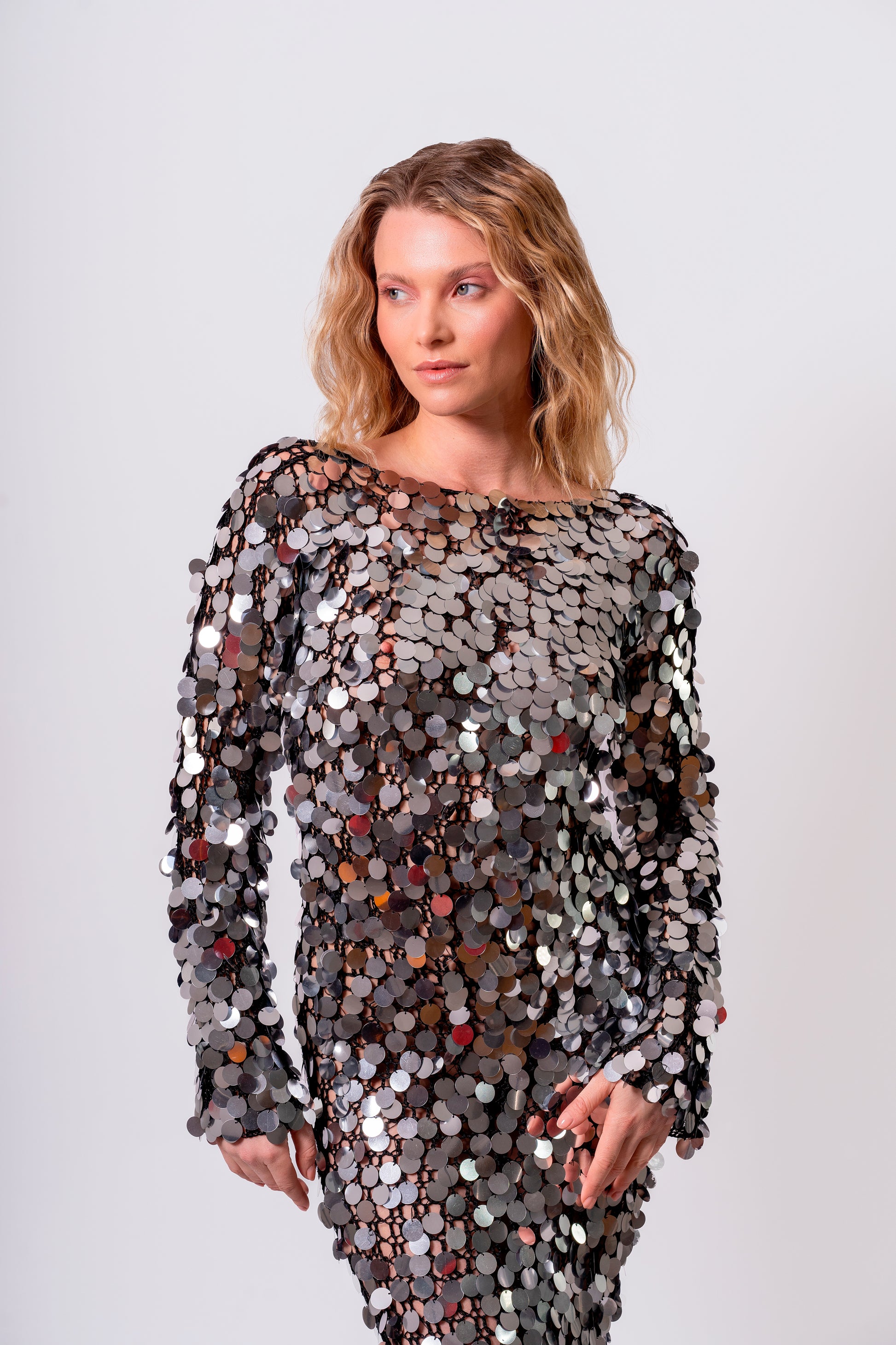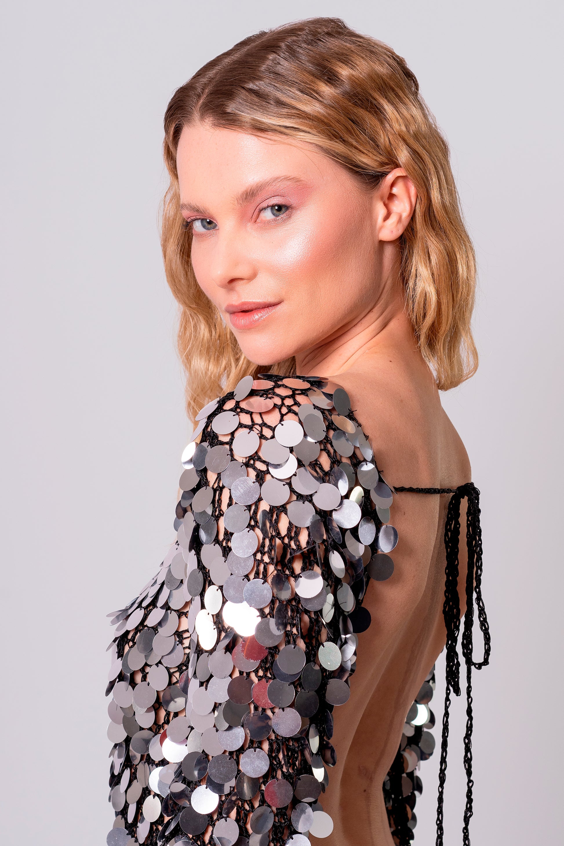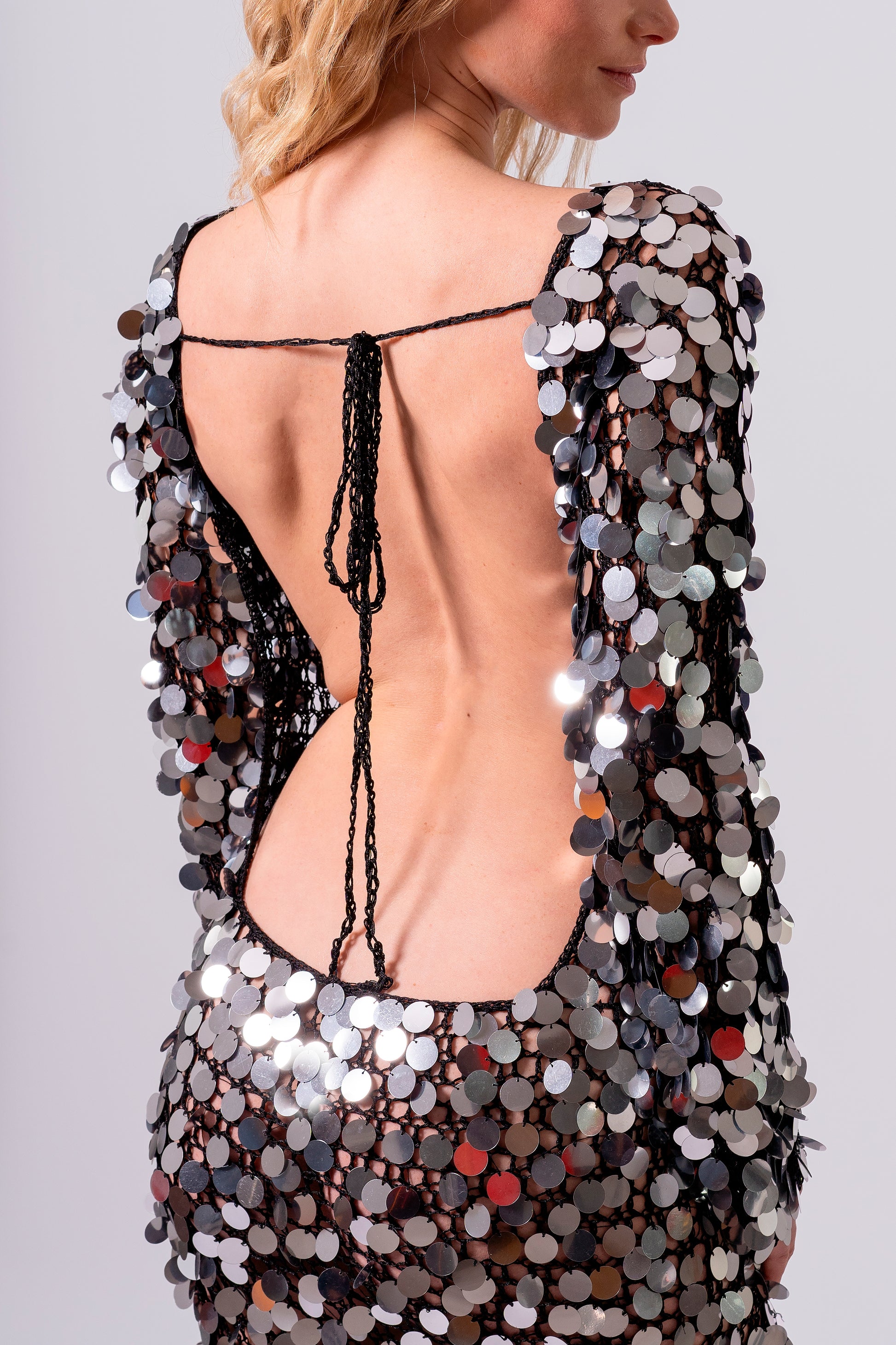 Dress in crochet, made all by hand in Brazil with applied sequins also, by hand one by one , with a profund open back for a Sexy Queen .