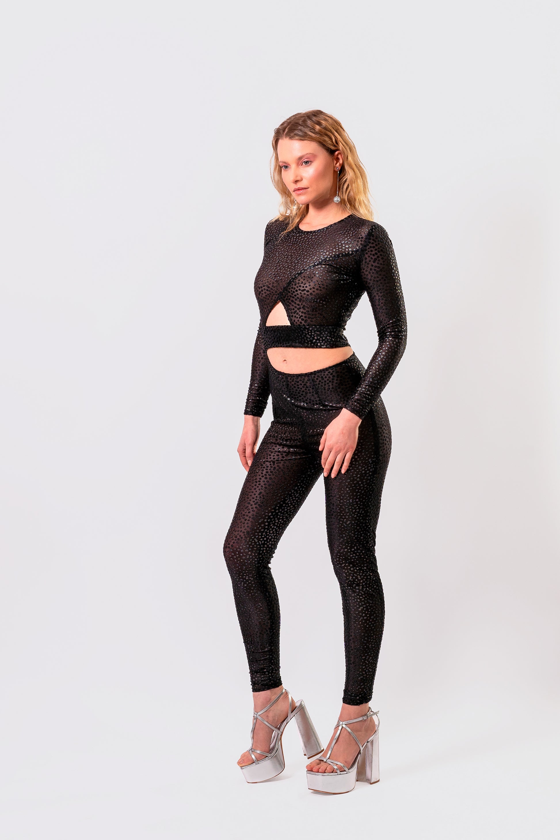 Combinaison transparente avec détail découpé au niveau du ventre et jambes fuselées. Confectionnée dans un tissu exceptionnel qui scintille au gré des mouvements du corps.